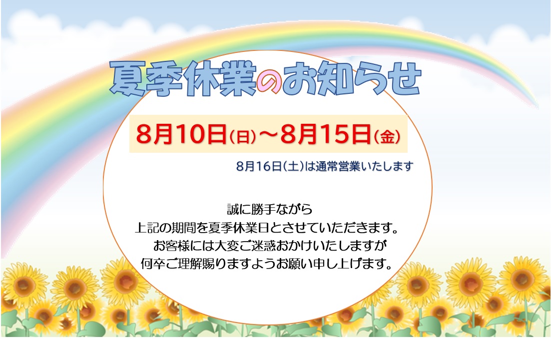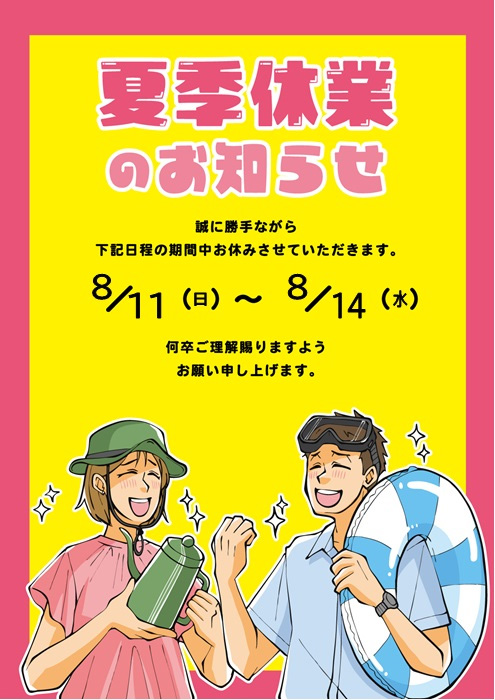 誠に勝手ながら、下記日程の期間中お休みをさせていただきます。8/11(月)~8/14(水)何卒ご理解賜りますようお願い申し上げます。