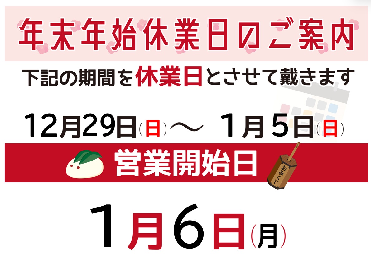 年末年始のお知らせです。 年内は28日までの営業となります。年始は6日(月)より通常営業させていただきます。 よろしくお願いいたします。